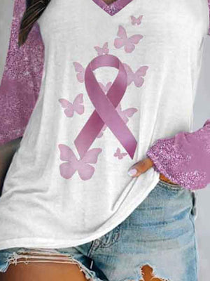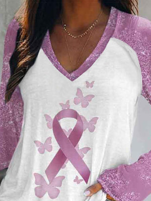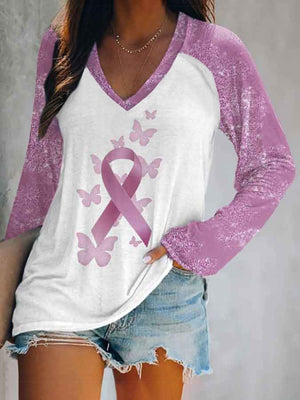 Women's Breast Cancer Floral Long Sleeve V Neck T-Shirt