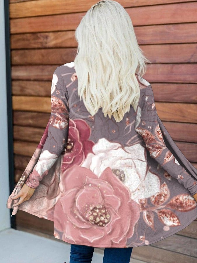Women's Breast Cancer Flower Print Long Sleeve Cardigan