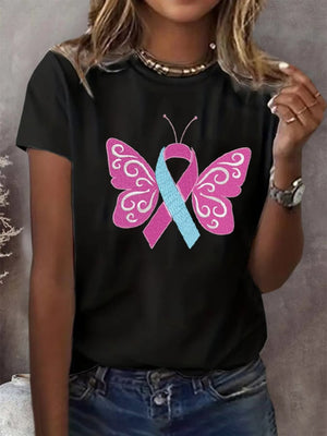 Women's Butterfly Pink Ribbon Breast Cancer Awareness Print T-Shirt