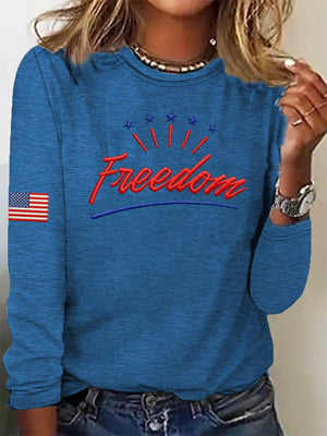 Women's Casual Freedom Flag Contrast Color Cotton Long-Sleeved T-Shirt