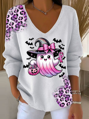 Women's Casual Pierced Breast Cancer Ghost Leopard Print Long Sleeve T-Shirt