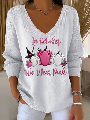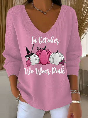 Women's Casual Striped Breast Cancer In October We Wear Pink Print Long Sleeve T-shirt