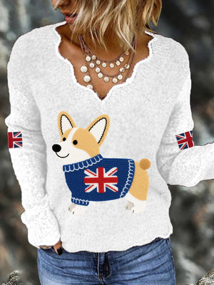 Women's Cute Corgi Union Jack Print Casual Long Sleeve Top