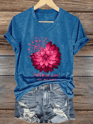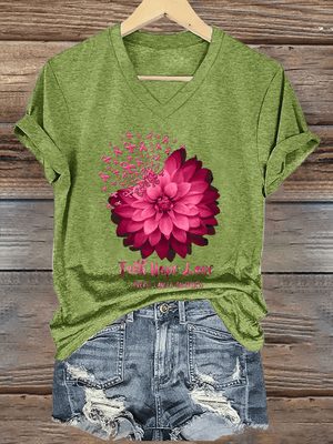 Women's Daisy Faith Pink Ribbon Breast Cancer Awareness Print V Neck Short Sleeve T-Shirt