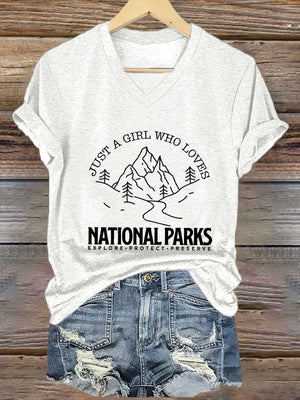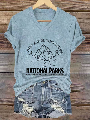 Women's Just A Girl Who Loves National Parks Printed V-Neck T-Shirt