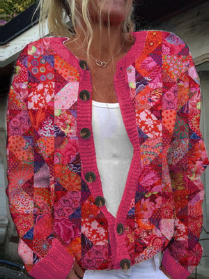 Women's Pink Breast Cancer Quilt Pattern Print Knit Cardigan