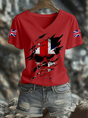Women's UK Flag Skull Print Casual V-Neck Tee