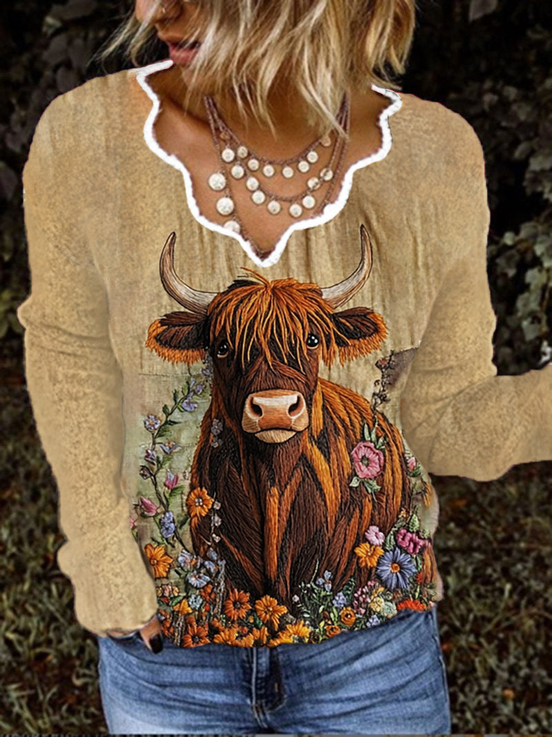 Women's Vintage Scotland Highland Cow Flower Casual Long Sleeve Top